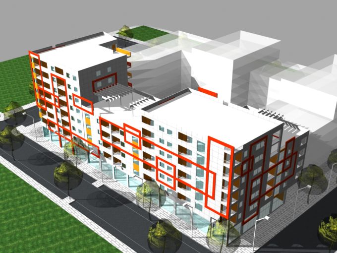 “Design for mixed use multi family residential and commercial building in a an urban area.”