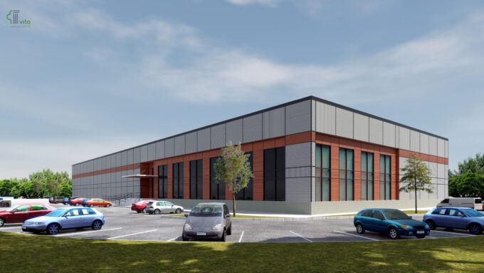 Commercial single story facility. Warehouse, Single Tenant. Commercial, Multipurpose. Street View Rendering Bird’s Eye Rendering